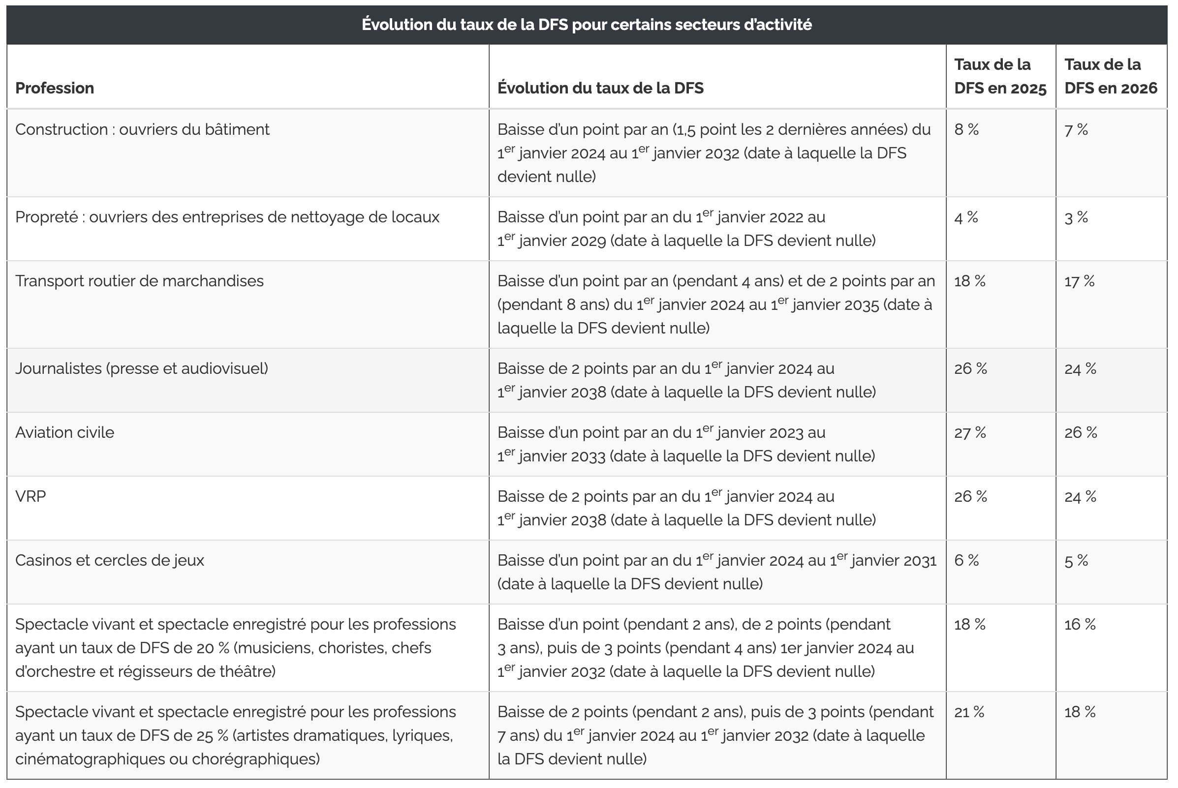 Certaines professions avaient déjà vu leur DFS diminuer selon un calendrier progressif, désormais officialisé sans modification.